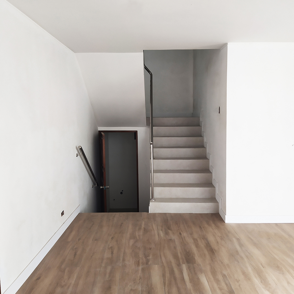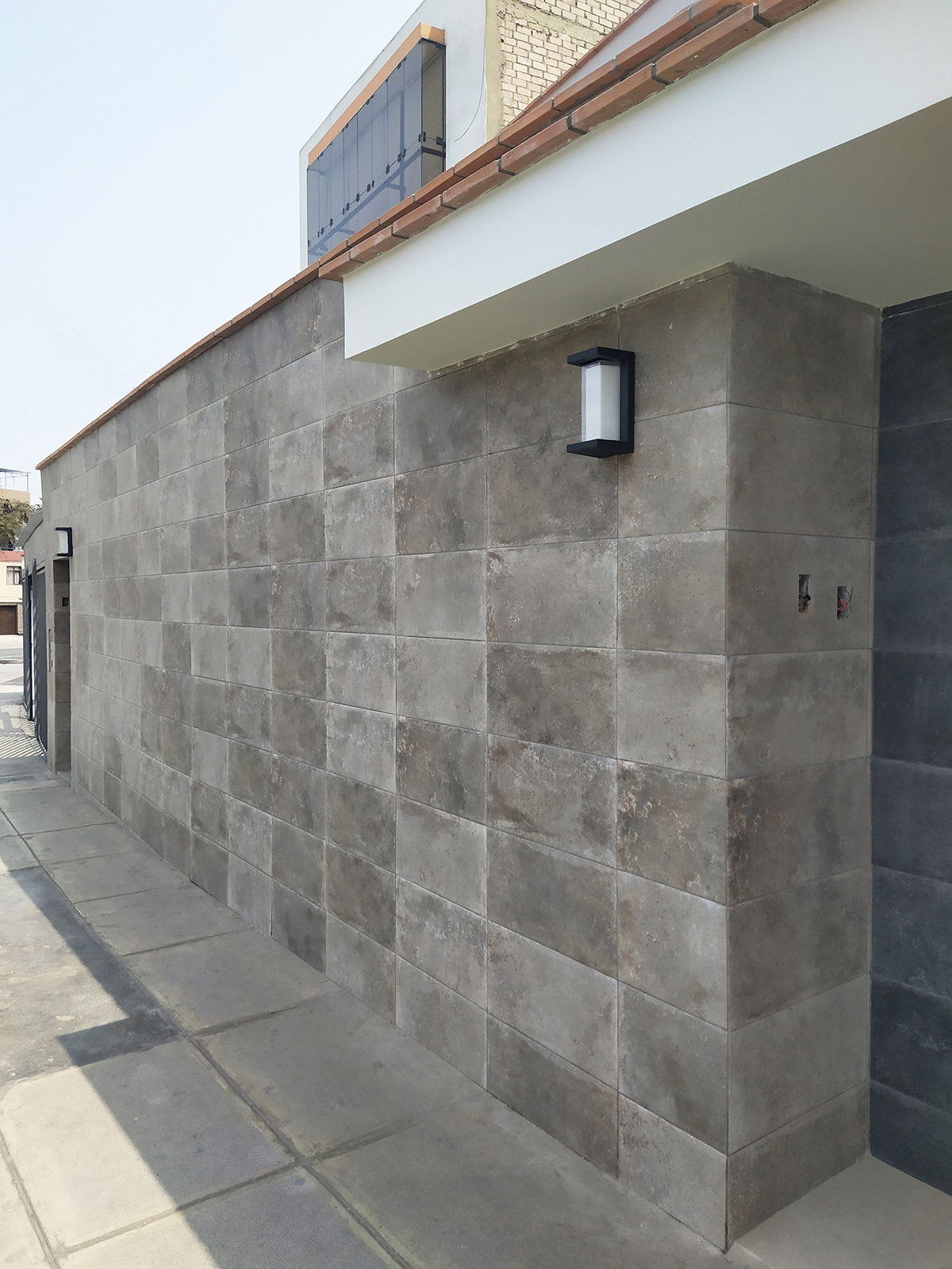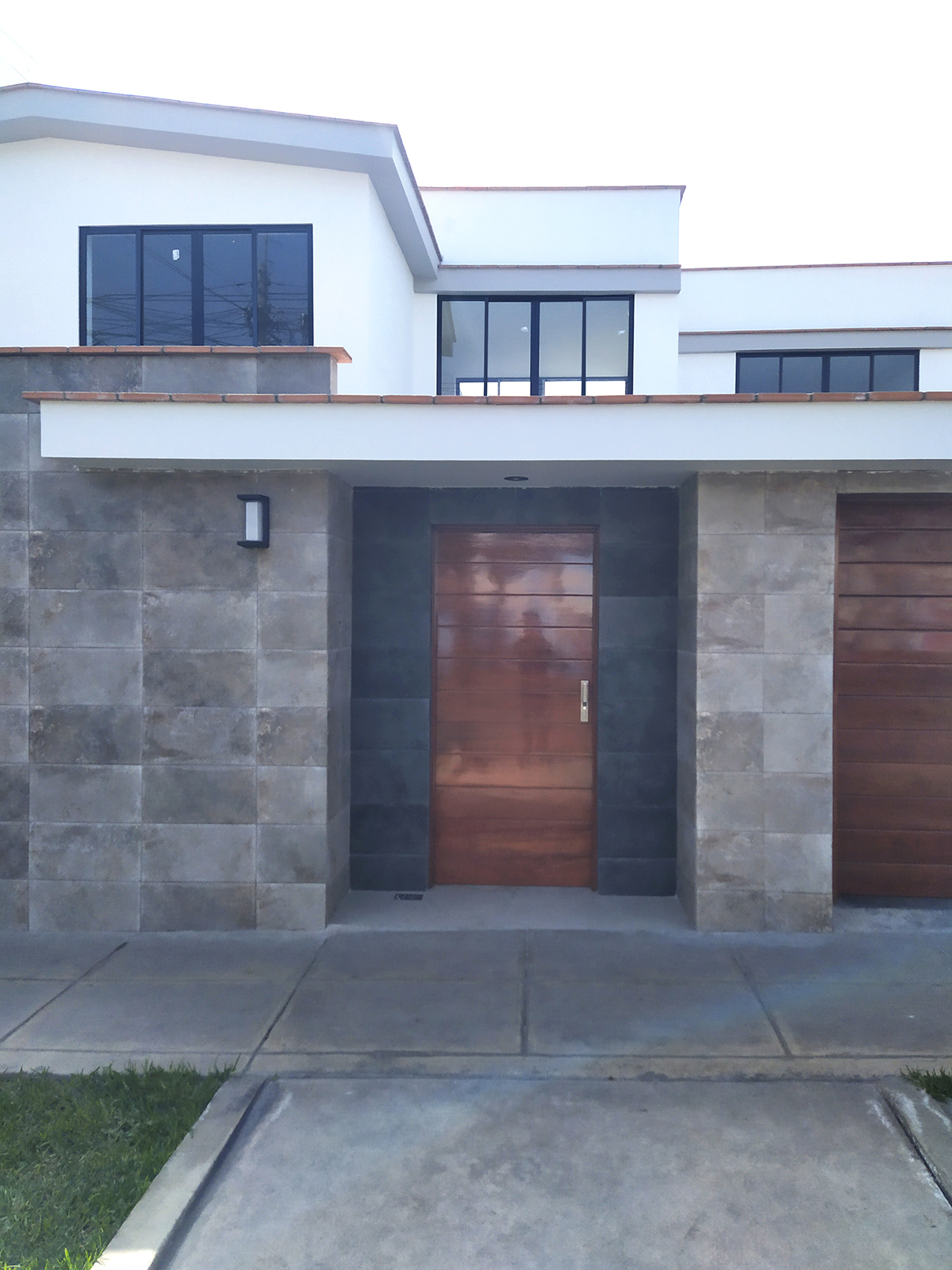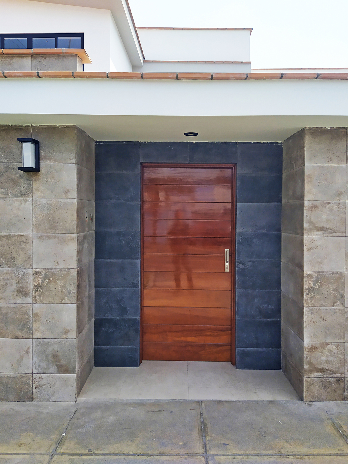 Se proponen muebles de melanina en tonalidades marrones y beige al igual que en piso de porcelanato para los interiores. En el patio posterior se genera un sol y sombra adosado a la vivienda como elemento de transición interior-exterior y una zona de parrilla-barbacoa que integra un baño, parrillas, horno de leña y bancada, cubierto por otro sol y sombra de mayor altura.