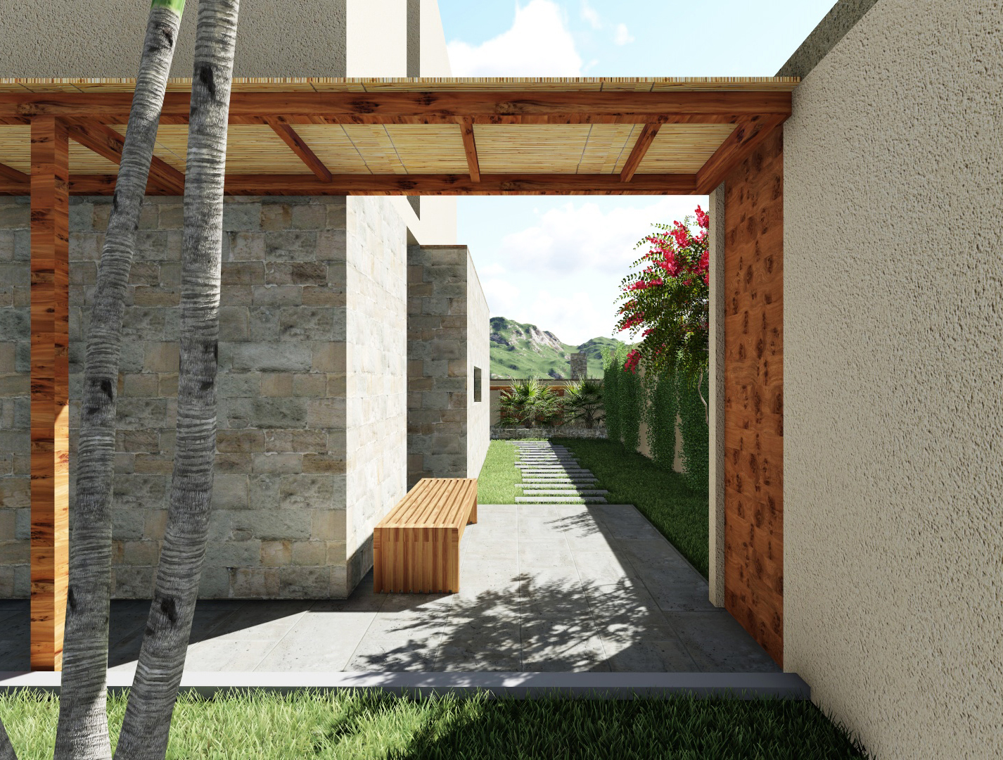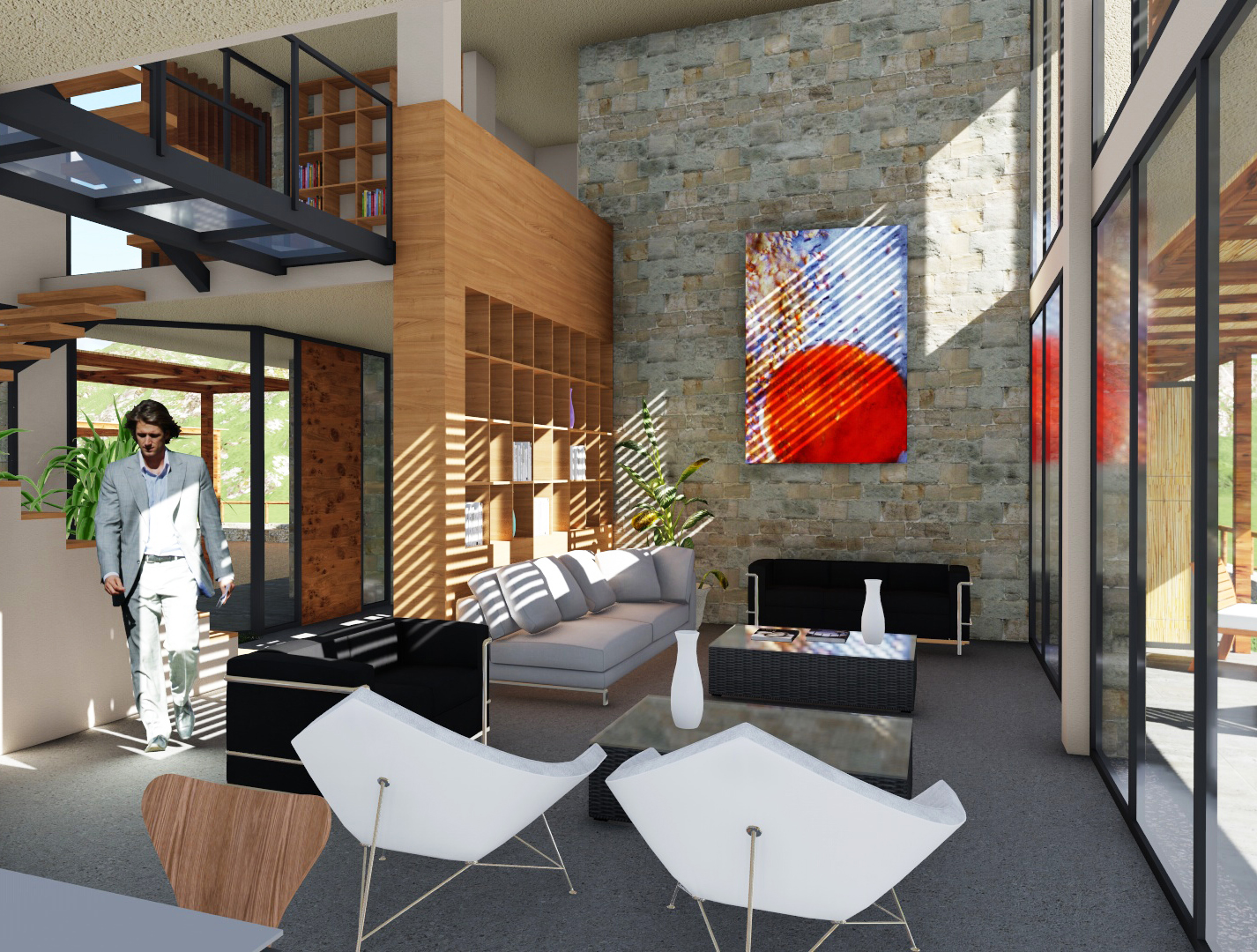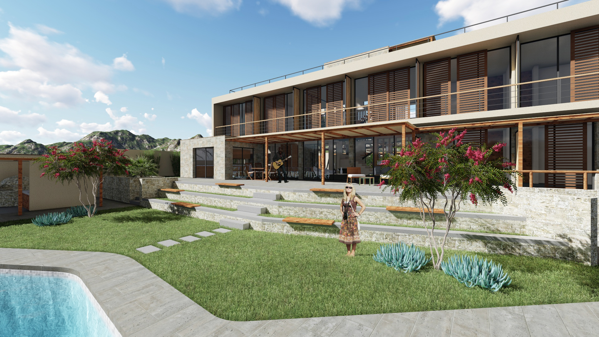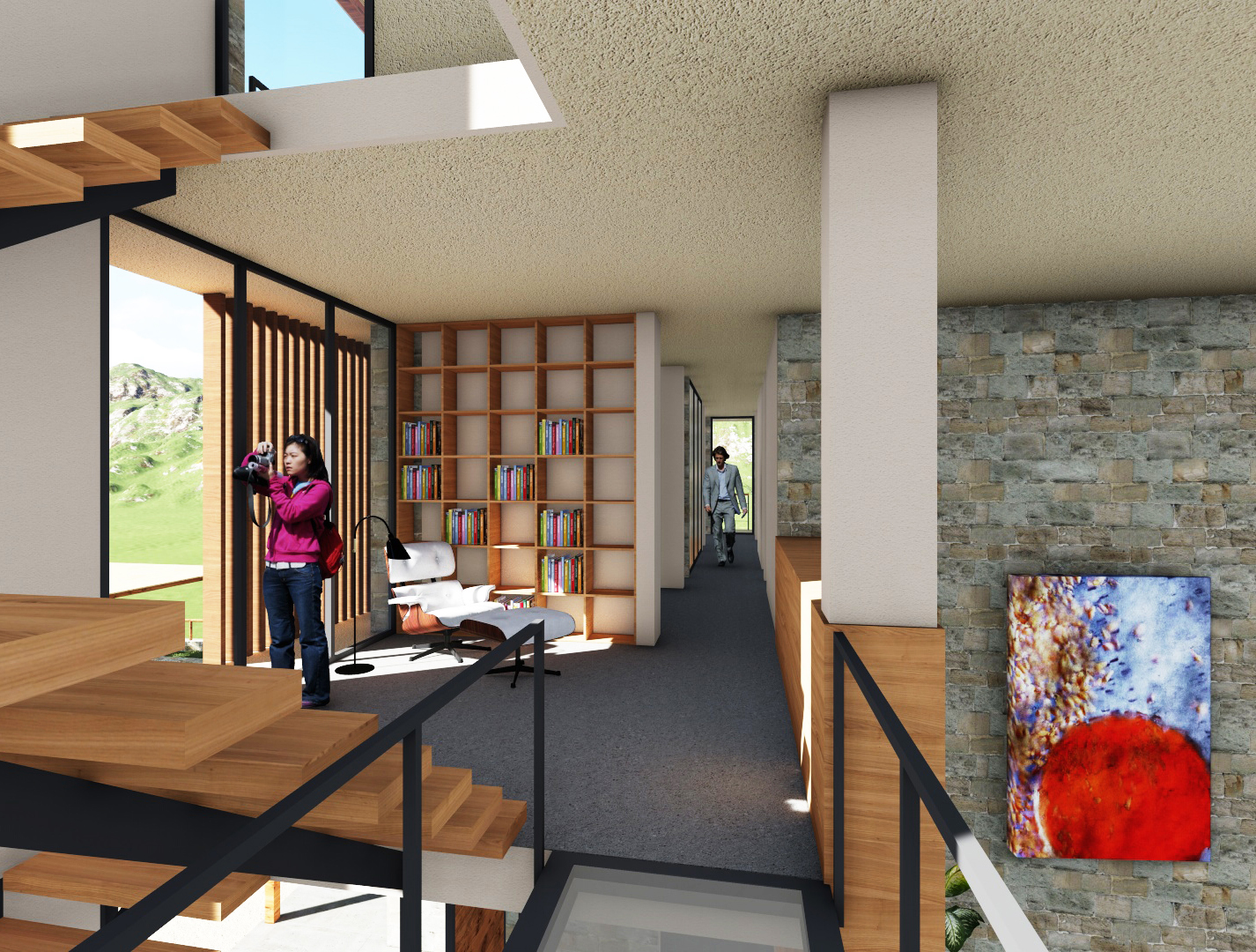 Descripción: Vivienda unifamiliar en Lomas de Pachacámac. Ubicada en un terreno en pendiente con vista al valle de Pachácamac, se propone una vivienda lineal situada en lo alto del lote que permita la vista de todas las estancias hacia el valle.