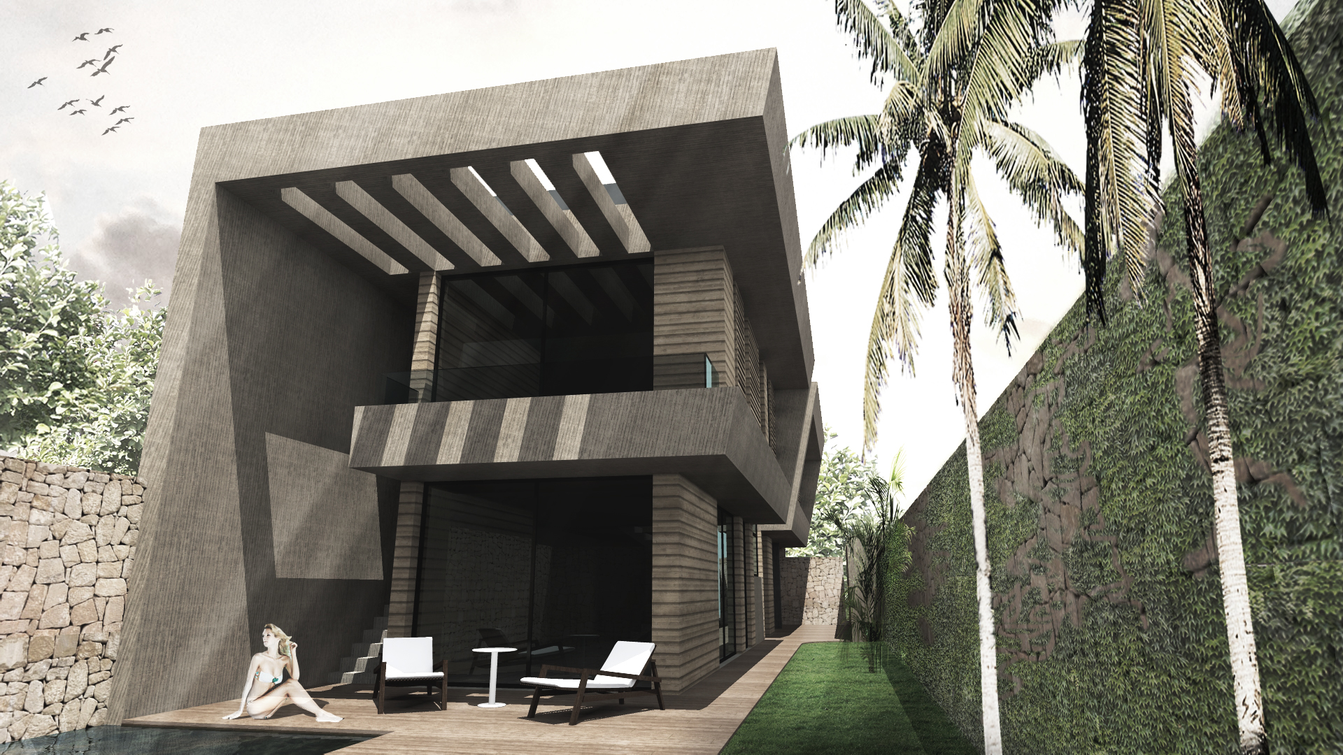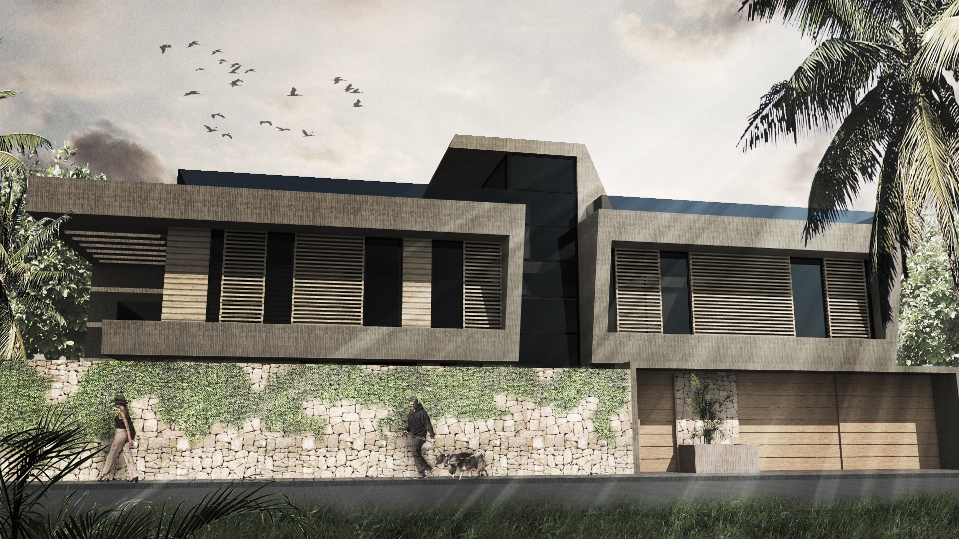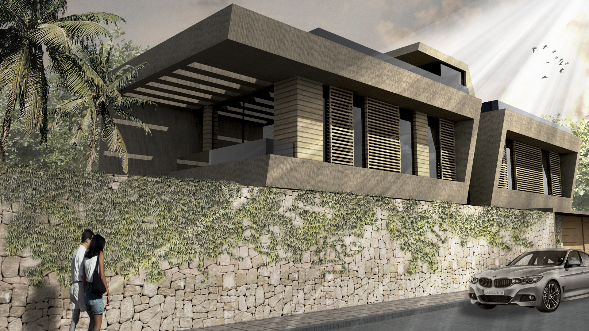 Descripción: Proyecto de vivienda unifamiliar en Pachacámac. En planta primera se desarrollan las zonas comunes de sala, comedor, cocina y estacionamientos, y en planta segunda 3 dormitorios con 2 baños. La materialidad se resuelve mediente hormigón visto y piedra haciendo referencia a la arquitectura vernacular del lugar.