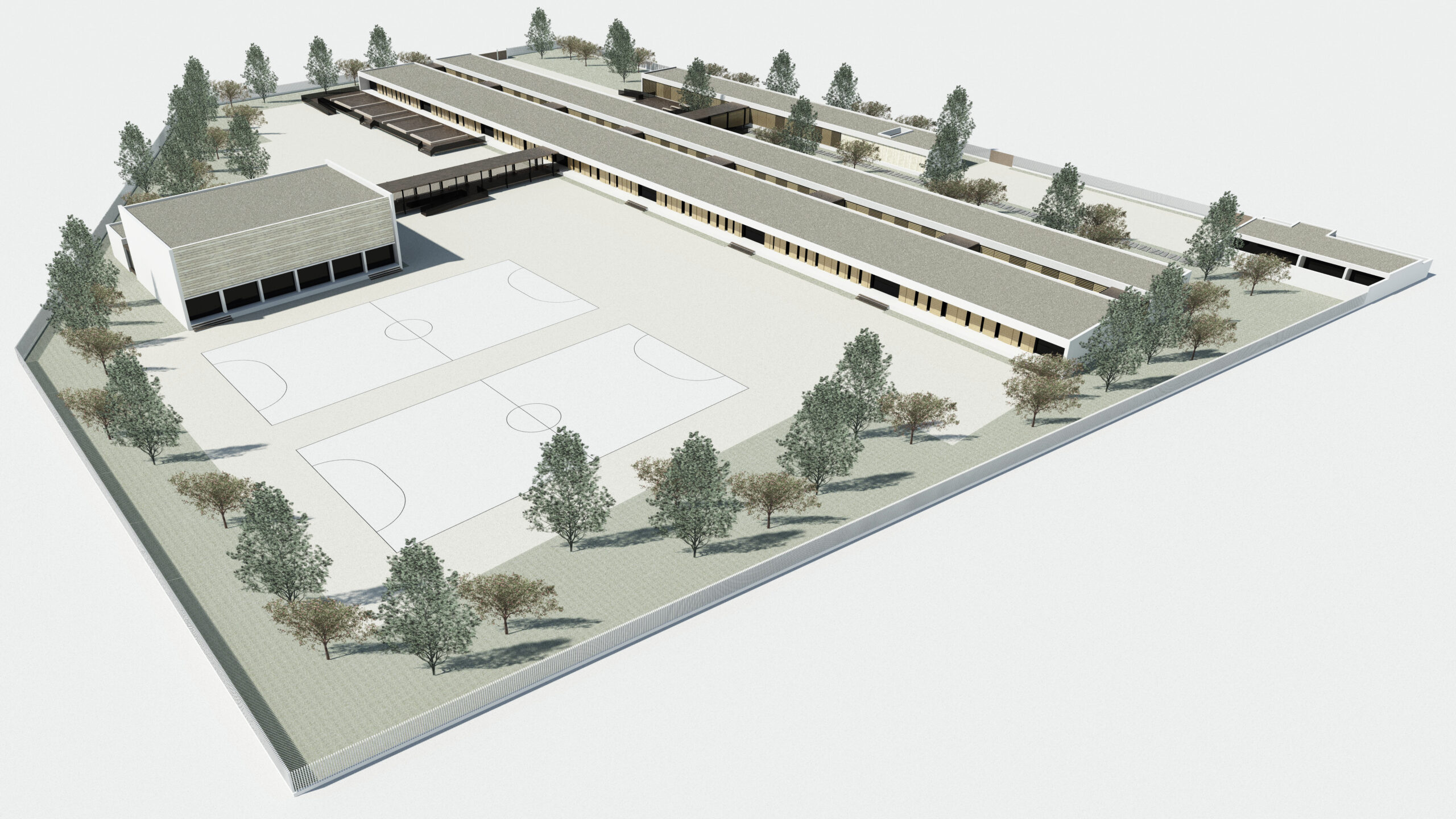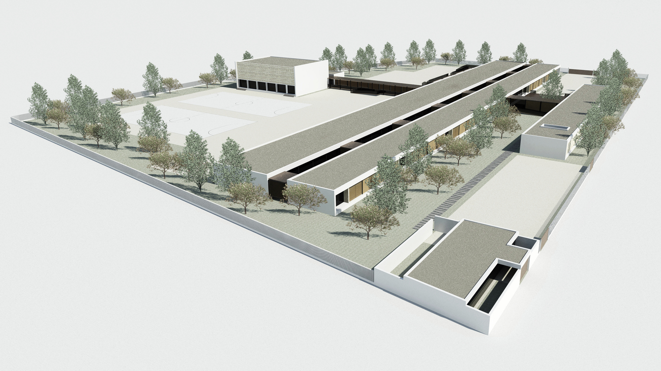 Descripción: Colegio de educación infantil y primaria en Carpesa. Ubicado estratégicamente en en el cruce de las vías de acceso a la población y orientado a sur. El proyecto se desarrolla en una sola planta mediante volúmenes paralelos conectados transversalmente por un eje de circulación que divide el edificio, así como el espacio exterior, en las zonas de infantil y primaria respectivamente.