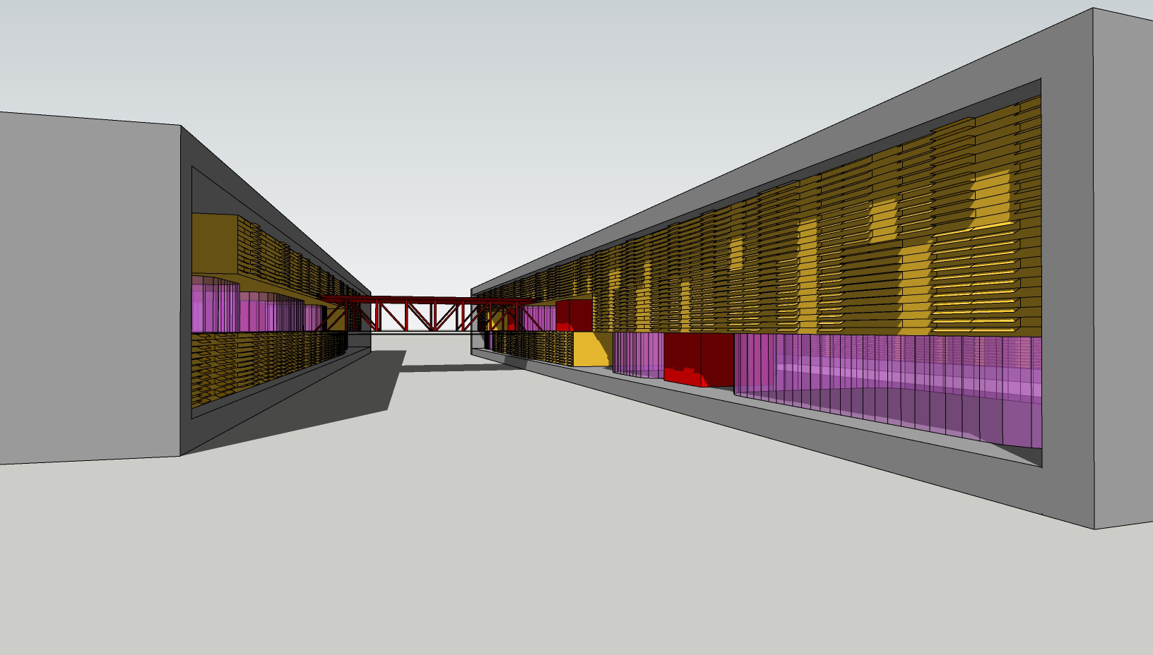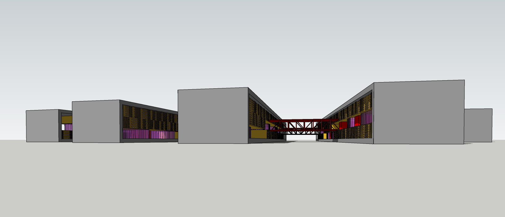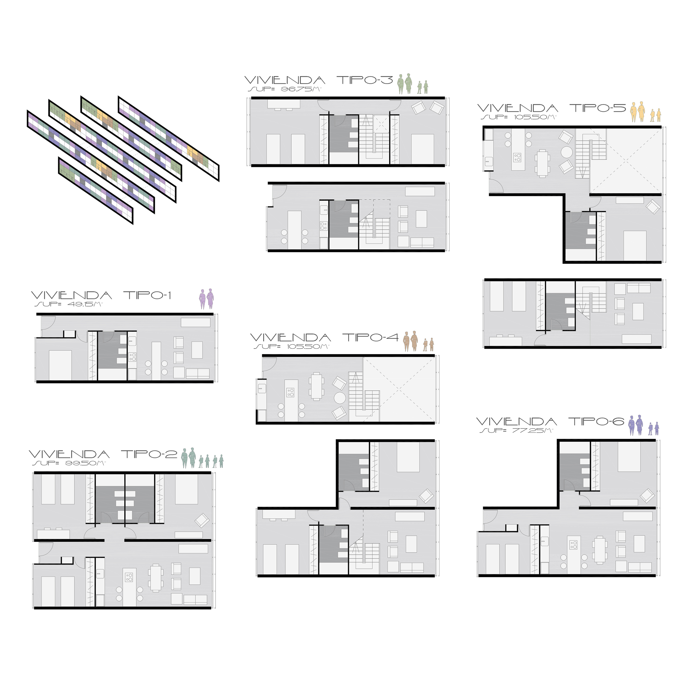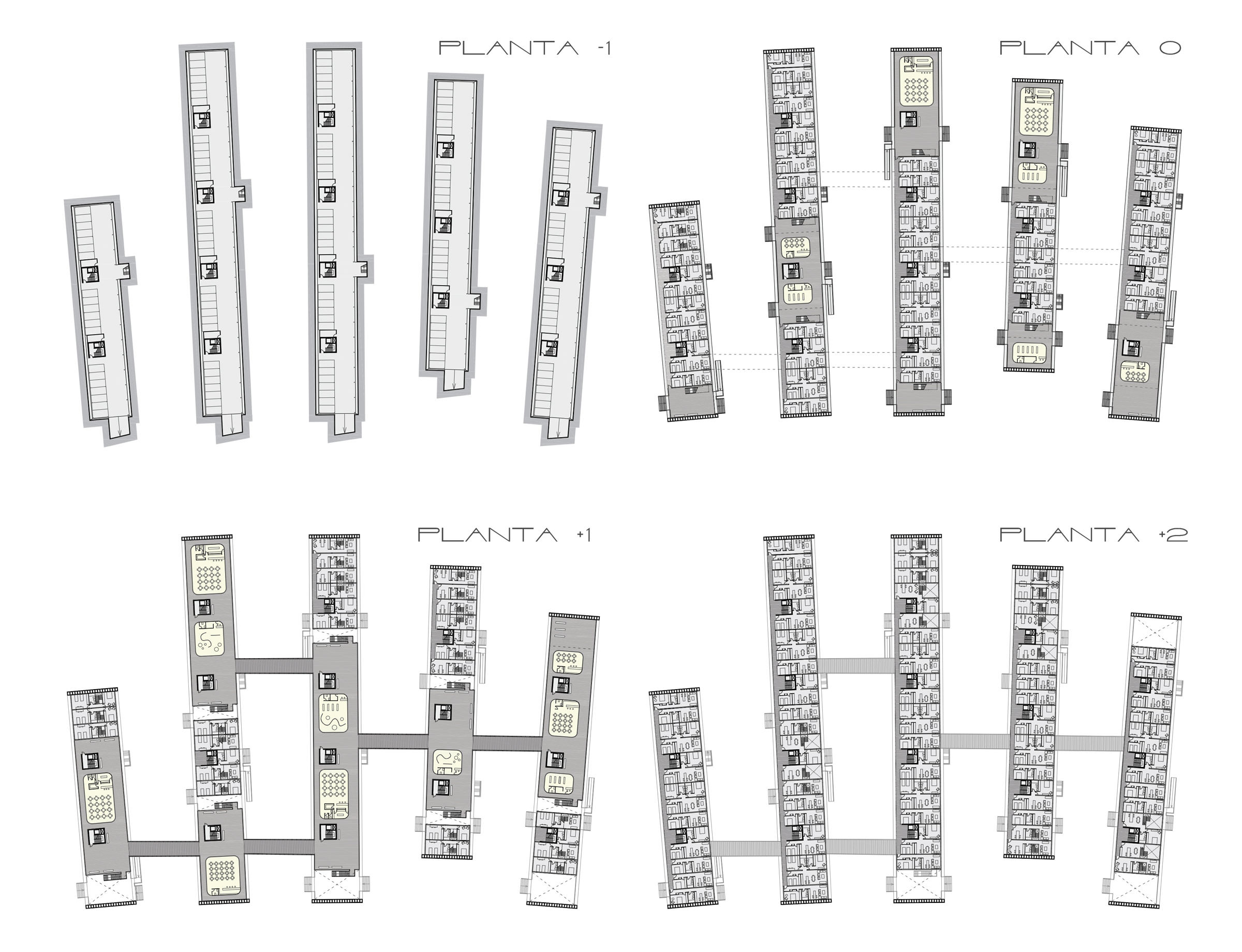 Descripción: Proyecto residencial + comercial generando condiciones de hibricidad de usos mediante la no estratificación de los mismos. Consiste en una serie de bloques de viviendas conectados por pasarelas a los que se les realizan perforaciones donde ubicar los usos comerciales.